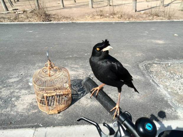 Setelah dirasa sudah jinak jalak kerbau bisa dibawa keluar, tentu ini tergantung keberanian pemiliknya masing-masing. Karena tahap ini beresiko jalak terbang bebas dan tidak kembali lagi. Jika masih takut bisa dengan mengikat jalak dengan benang kasur di kaki, lalu di tenggerkan di tangan atau di sepeda (bebas) agar jalak terbiasa dengan suasana luar. Saat jalak diikat benang, kita lihat gerak-geriknya, panik atau tenang, jika tenang berarti sudah cukup aman melepas jalak. tapi kembali lagi pada pemilik jalak, berani atau tidak hehe.