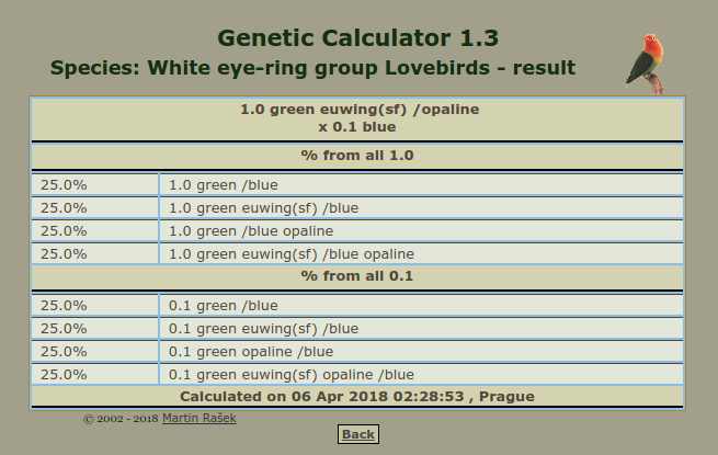 Harga green/josan split biola berkisar antara 6-8 juta. Harga blue series betina kisaran 1-3 juta. Lalu seberapa besar peluang kita? Mari kita hitung di kalkulator genetik